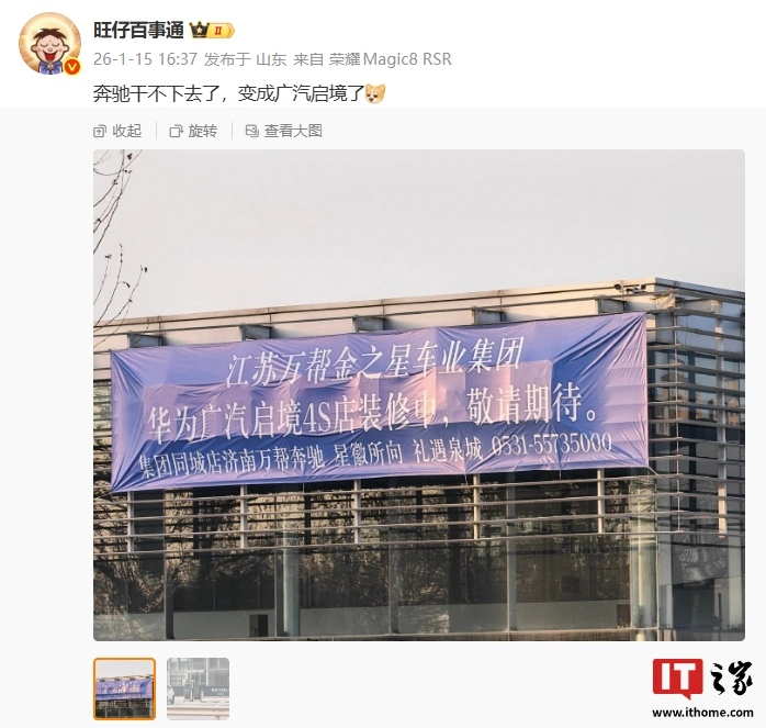 博主 @旺仔百事通 今日分享了启境品牌的进展,其微博配图显示,江苏万帮金之星车业集团已启动“启境”4S 店的装修。IT之家注意到,万帮金之星旗下的门店包括奔驰、奥迪、凯迪拉克、别克、领克、现代、埃安等。从博主微博原文来看,预计该门店是由奔驰店改装而来。